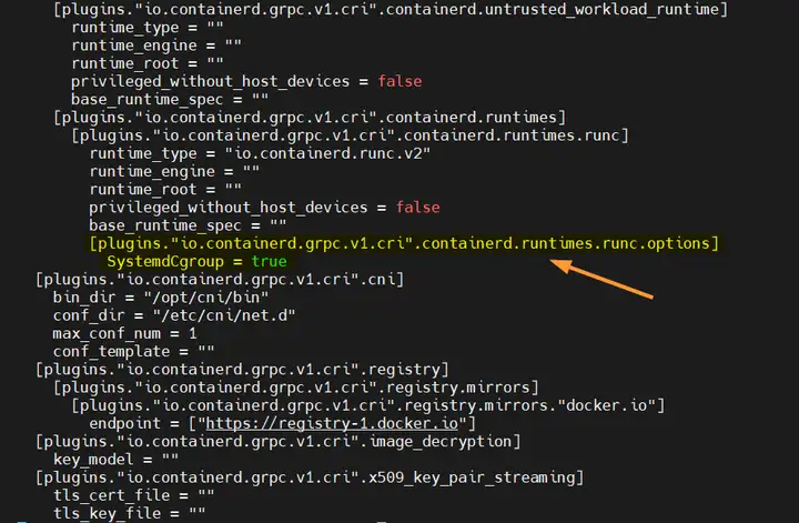 设置cgroupdriver为systemd,编辑 /etc/containerd/config.toml 文件,找到 [plugins."io.containerd.grpc.v1.cri".containerd.runtimes.runc.options] 部分,添加一行内容:SystemdCgroup = true